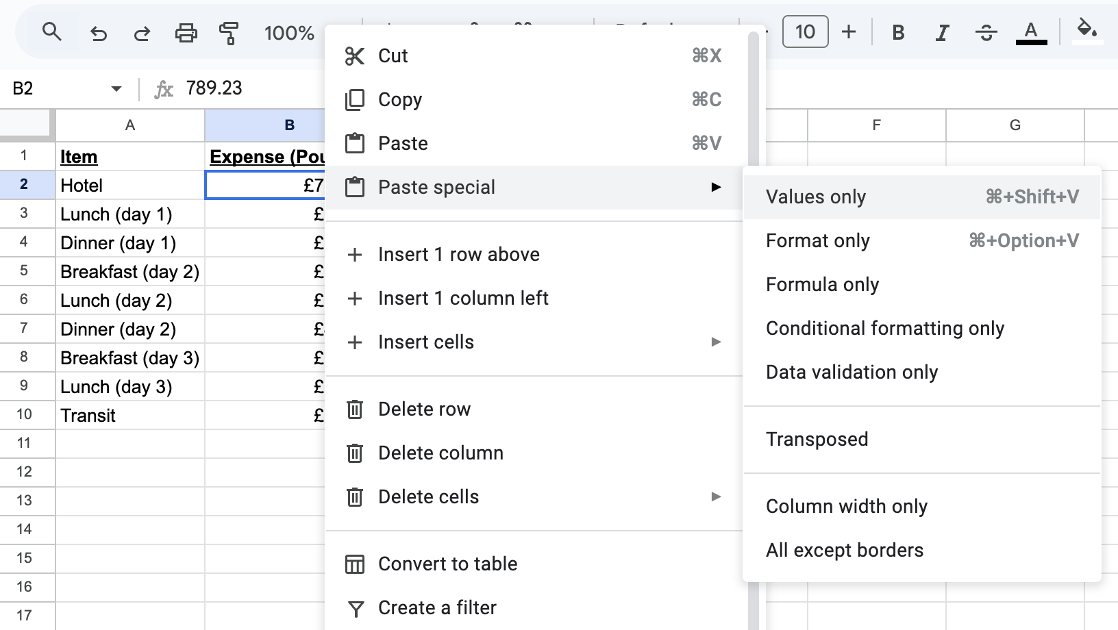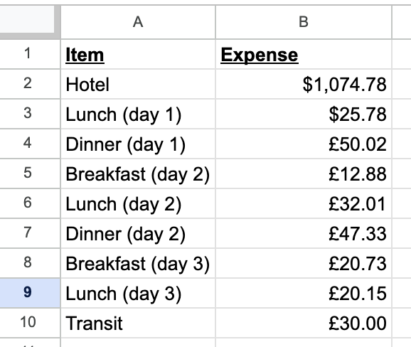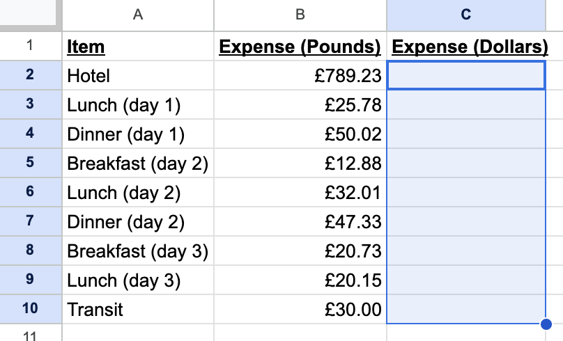 In this example, imagine that we need to make an expense report for a trip to London. We've got a list of amounts in pounds in column B.
