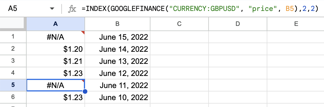 In our case, you'll notice that we didn't give the formula a date. That means that GOOGLEFINANCE will use whatever the current exchange rate is. If you leave it like that, it will display a new, updated value whenever Google Finance has a new rate.