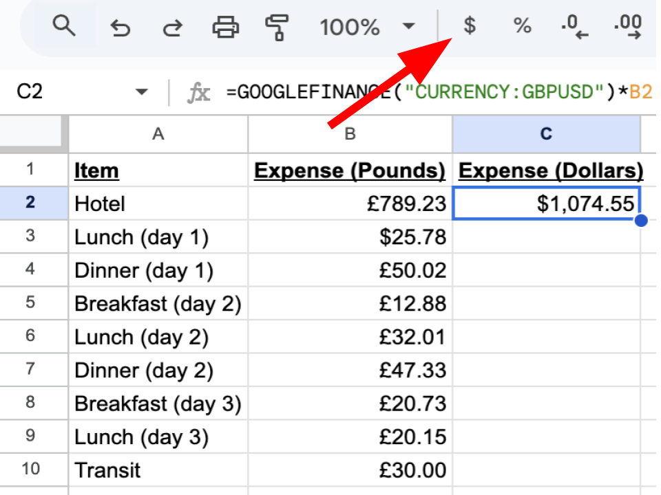 That will replace the original amount with the converted amount. If you haven't fixed the formatting yet, you can do that after pasting. Also be sure to update any labeling on your spreadsheet. In our example, column B was originally labeled Expenses (Pounds), so we've changed it to be less specific.