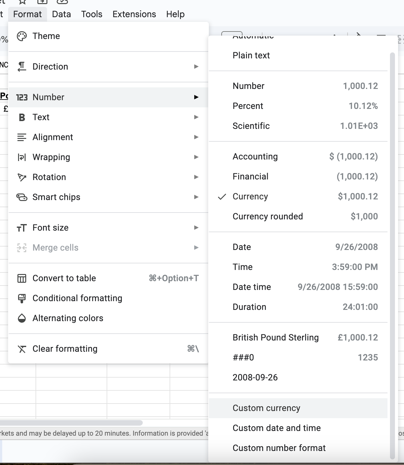If you don't see that in the menu, or if you want a different currency format, click on Format in the menu, then Number, then Custom Currency.